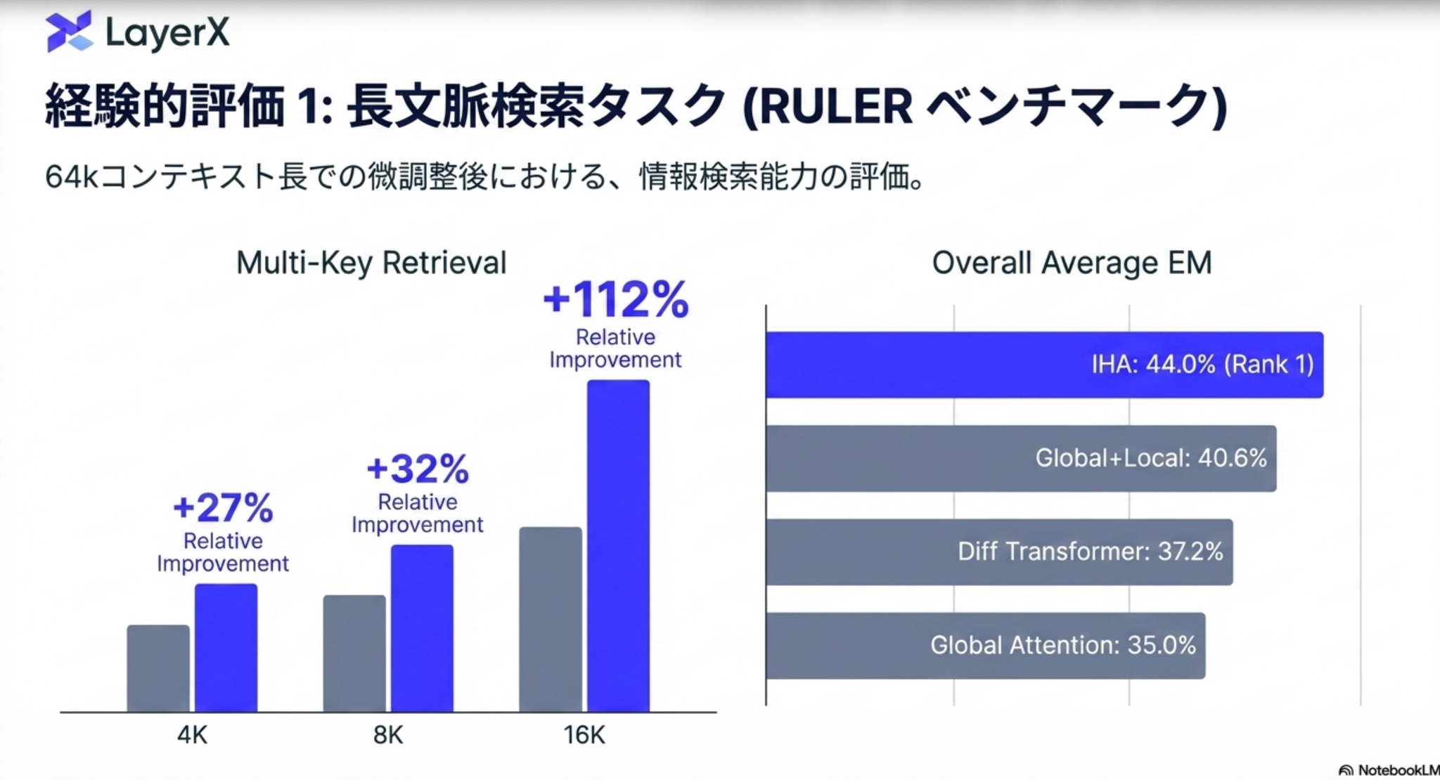 - 長文コンテキストにおける圧倒的優位性: RULERベンチマークのMulti-Key Retrievalにおいて、4kで+27%、8kで+32%、そして16kでは+112%という劇的な精度改善を記録。