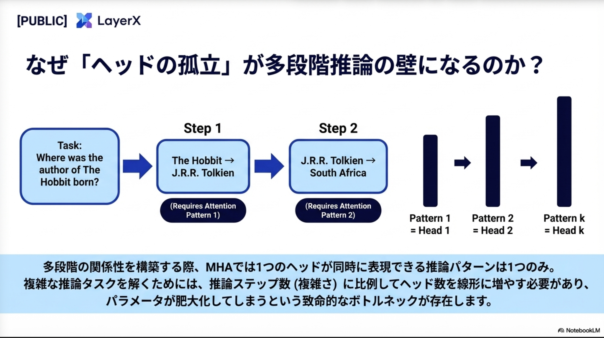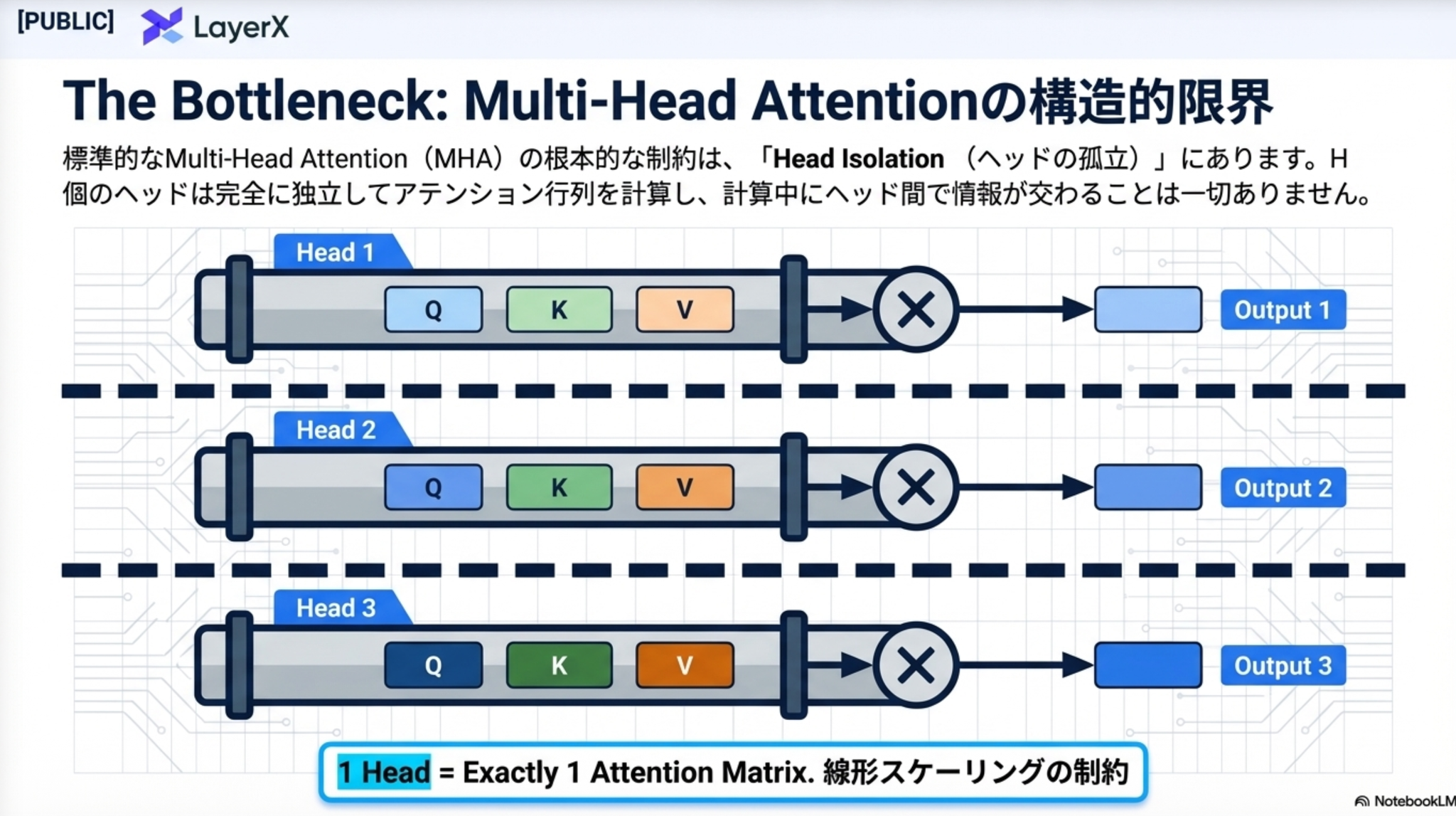 現在のトランスフォーマーモデルの中核をなすMHAは、効率的な並列計算を可能にしますが、多段階の推論結果を集約を必要とするタスクにおいては「ヘッドの孤立」と「線形スケーリング」という構造的欠陥が顕在化する。