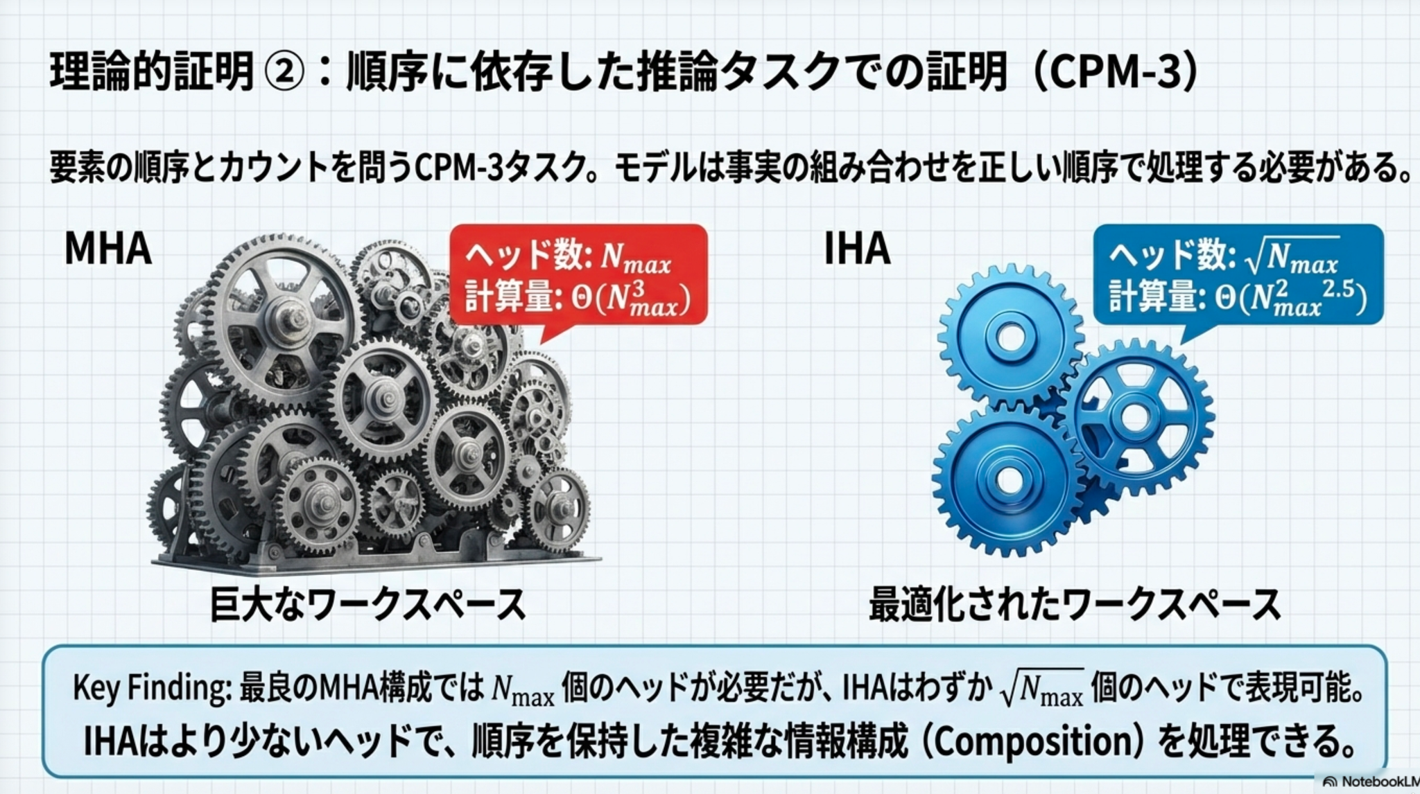 - 理論的な計算効率: 多段推論の代理タスク(CPM-3)において、MHAの計算コスト に対し、IHAはで同等の表現力を実現。