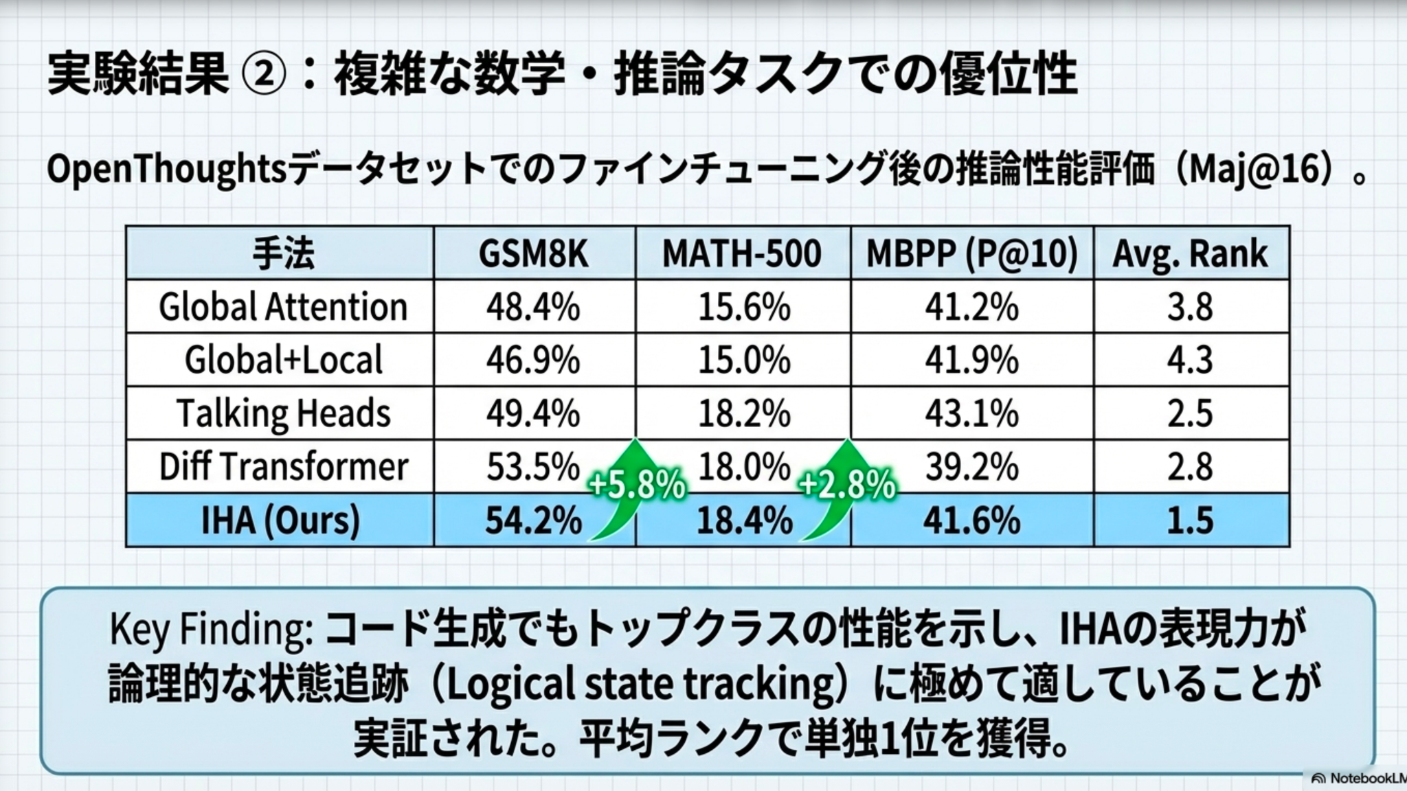 IHAは「線形パラメータコストで二次的な表現力」を提供する最も論理的なMHAの後継技術です。実験データが示す通り、特に推論能力と長文コンテキストの正確な処理において、これまでのトランスフォーマーの限界を大きく拡張しました。
