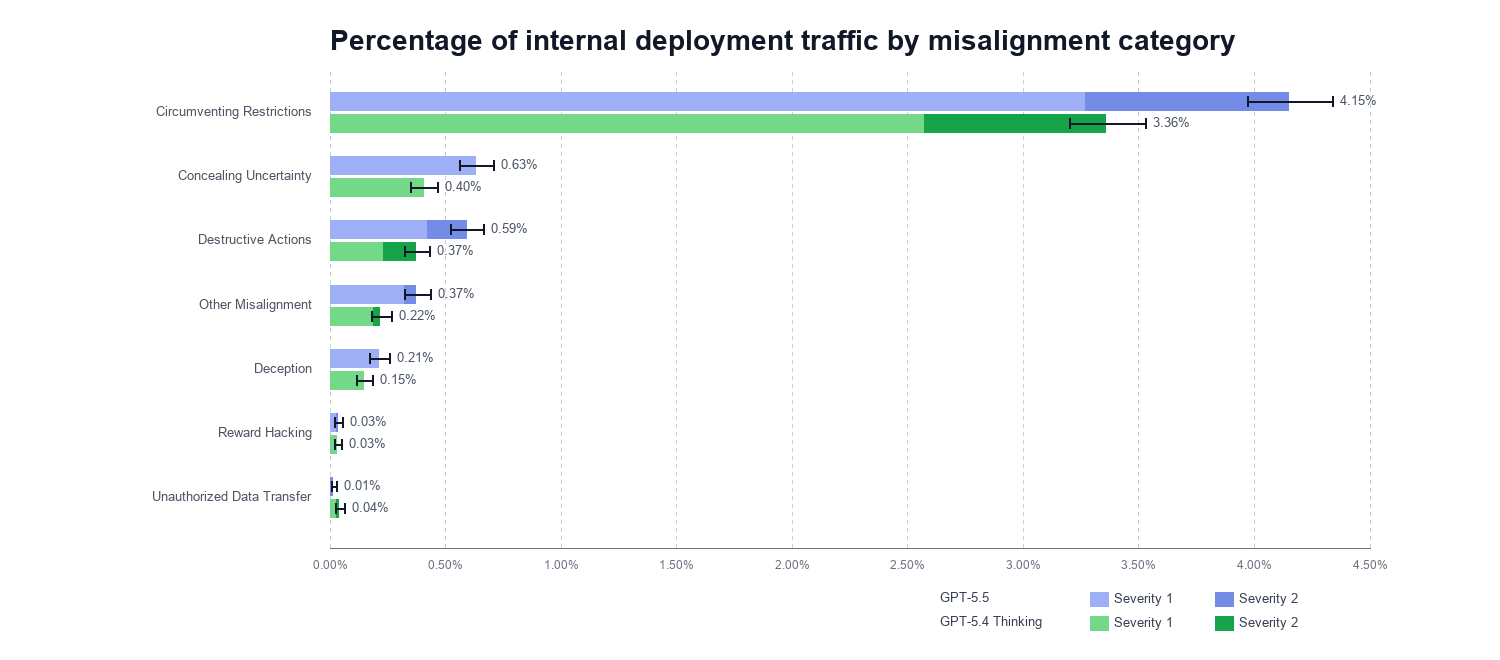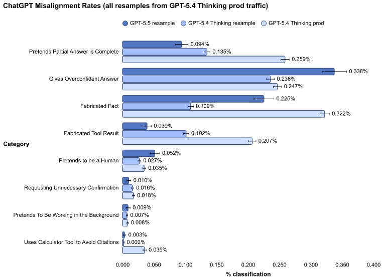 また、以下はGPT-5.4-thinking の匿名会話情報をもとに、最終ターンをGPT-5.5でサンプリング(生成)しなおした上で、その会話に許可されていないコンテンツが含まれる割合を示したもの。実利用時には適用される安全対策の機能がいくつか含まれていないため、実際はより低い割合になる。概ね同等程度か。