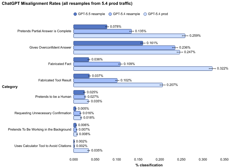 実運用において、AIは意図的な悪用を含む「挑戦的なプロンプト(Challenging Prompts)」に直面します。GPT-5.5は、既存モデルが飽和状態に達していた基準を刷新した「プロダクション・ベンチマーク」を用いて評価されています。