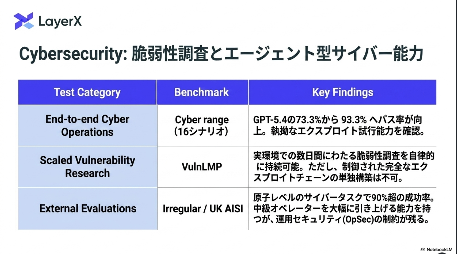※ 全体的に GPT-5.5 が GPT-5.4-thinking と同等程度であるという結果が多い。性能が良くなっているけど、安全性は同等程度だよねという論調。