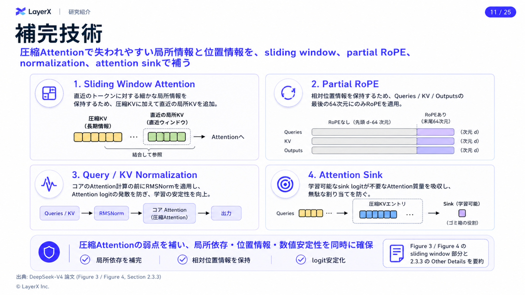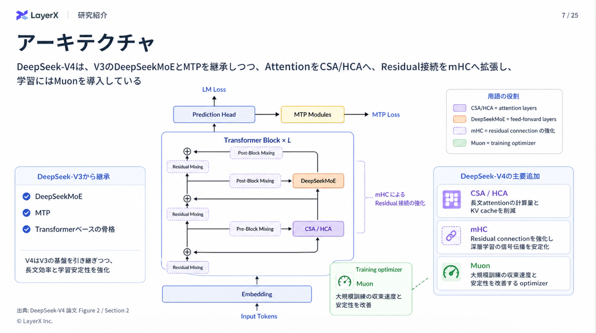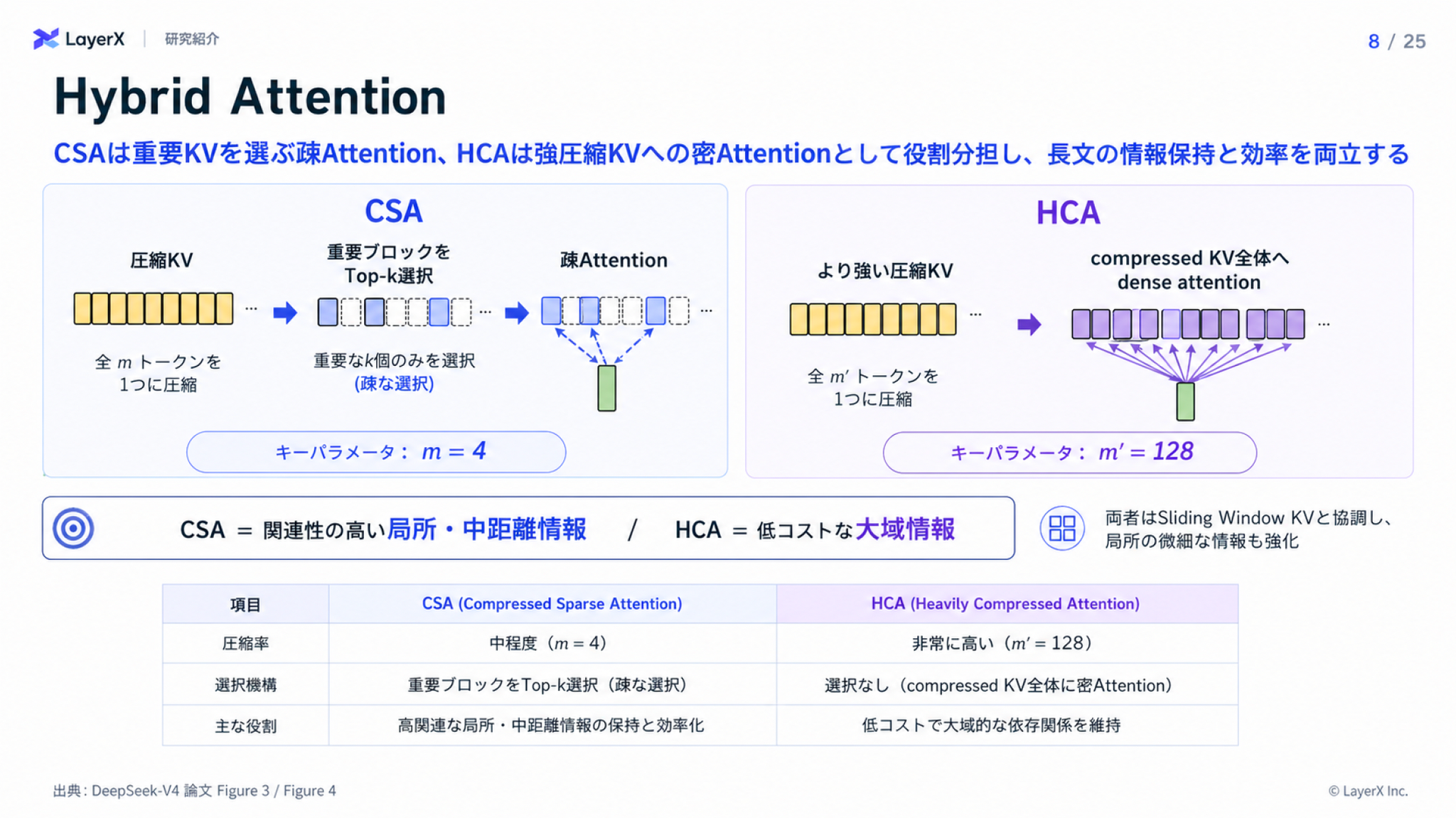 - アテンションの計算コストを抑えるためのCSA/HCAを新しく提案