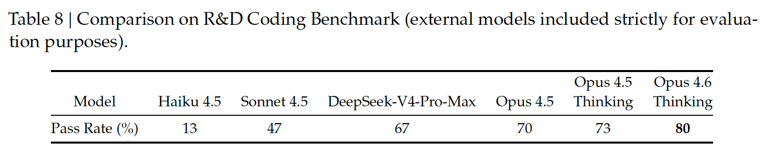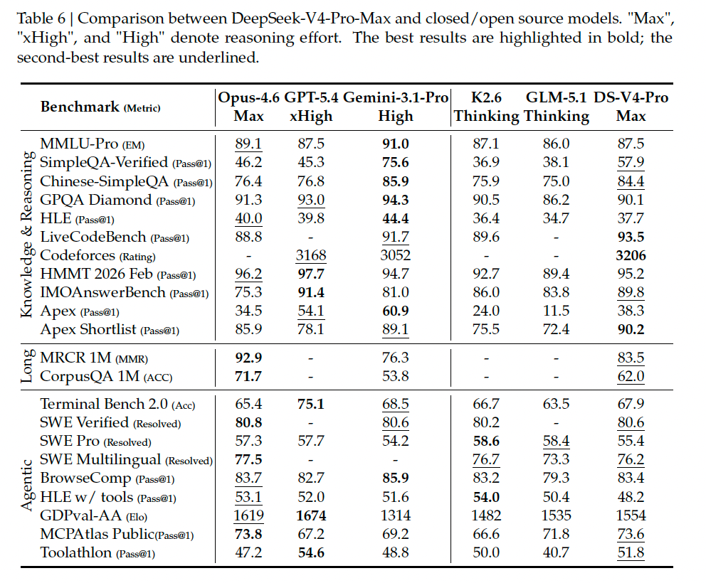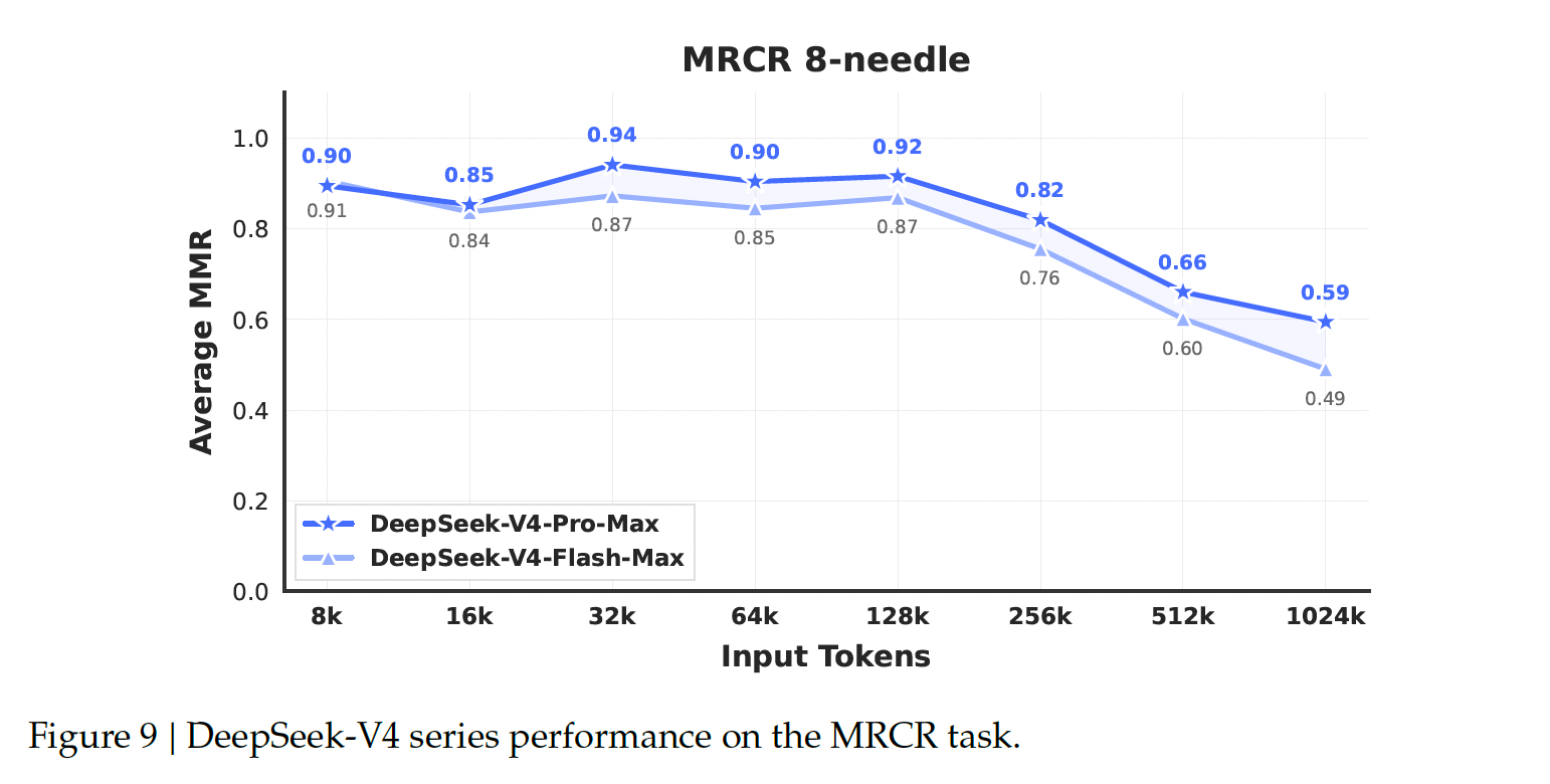 - DeepSeek‒V4‒ProはMRCRタスク(文脈内検索性能を測定する指標)においてGemini‒3.1‒Proを上回る性能を示すものの、Claude Opus 4.6には及ばない(上の表)