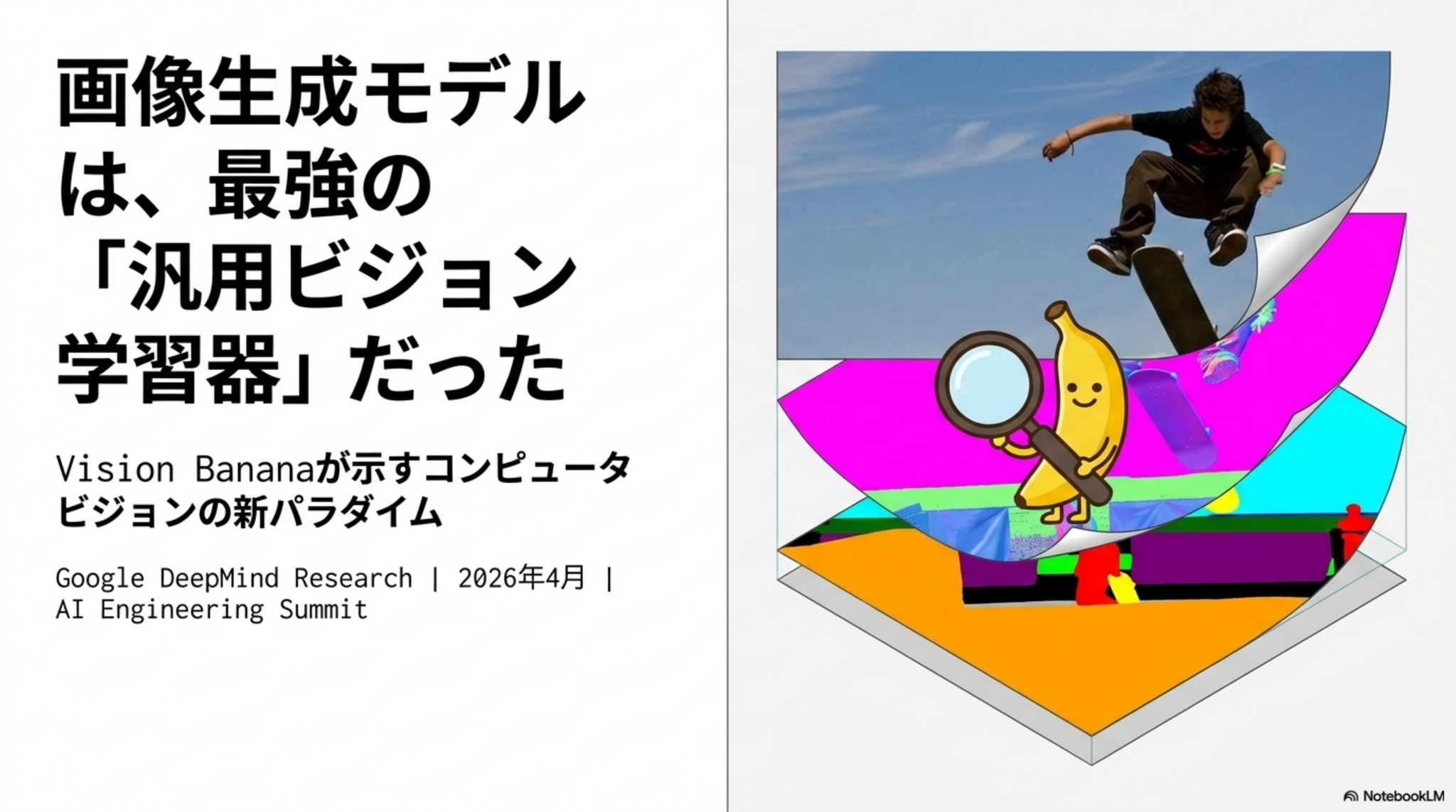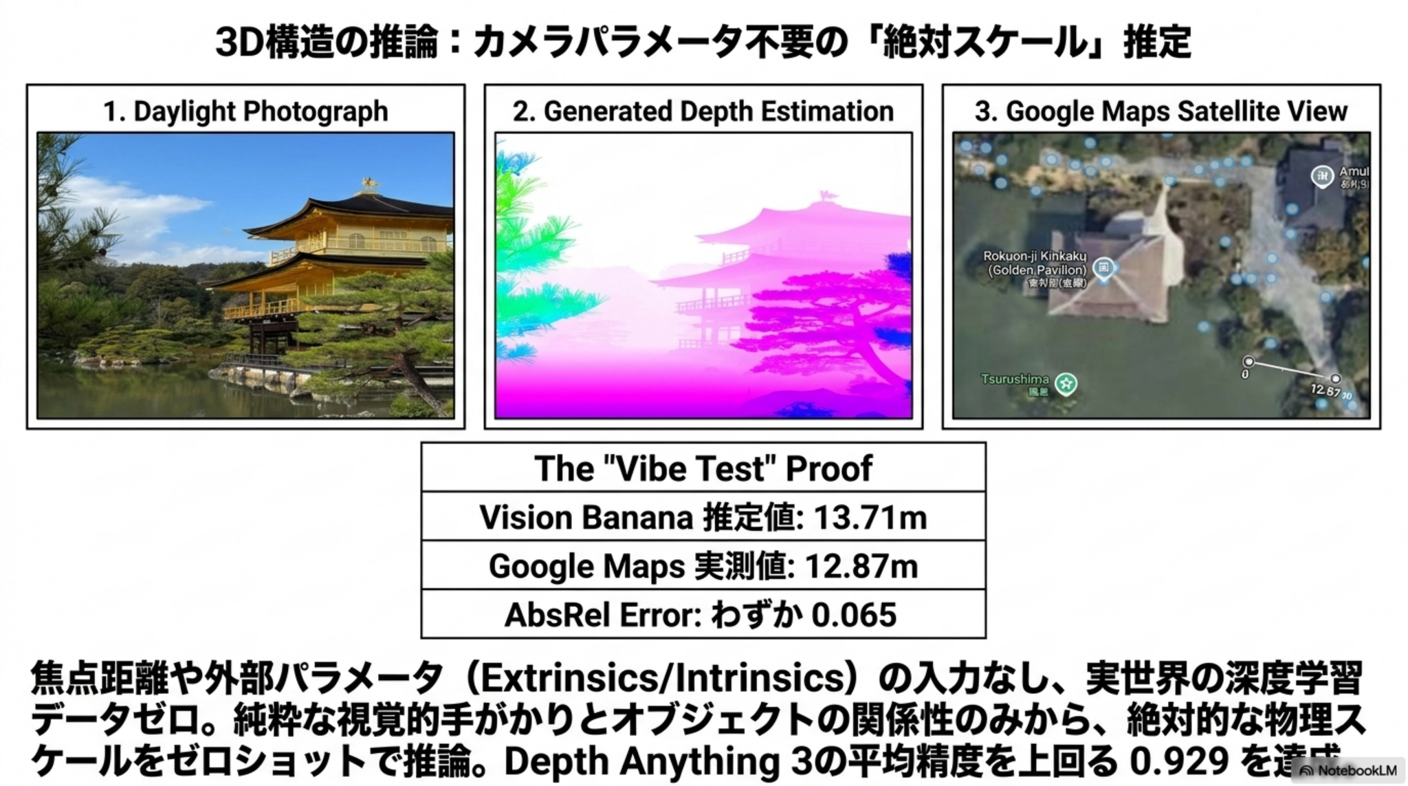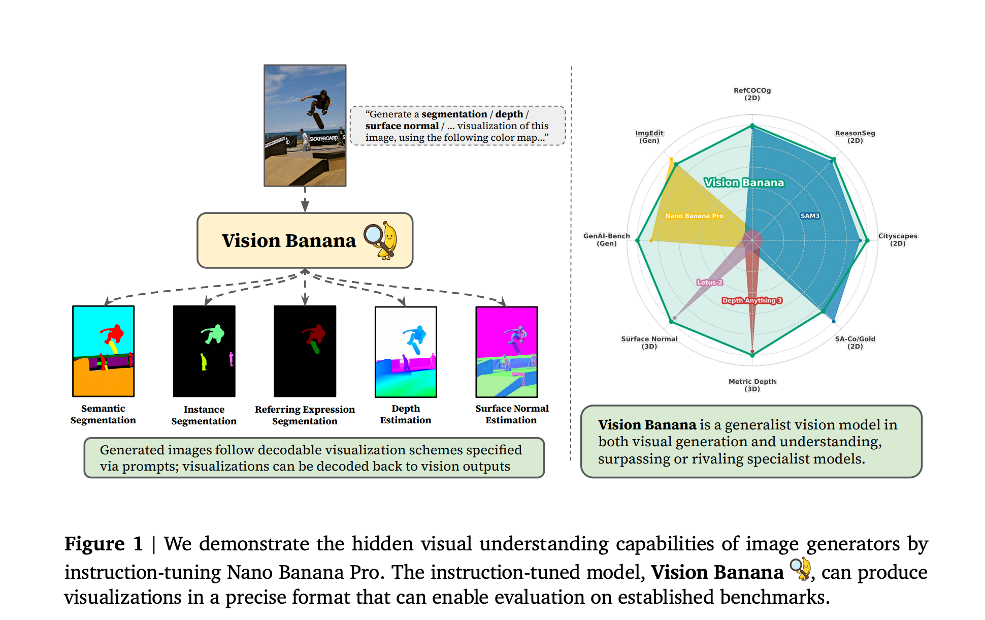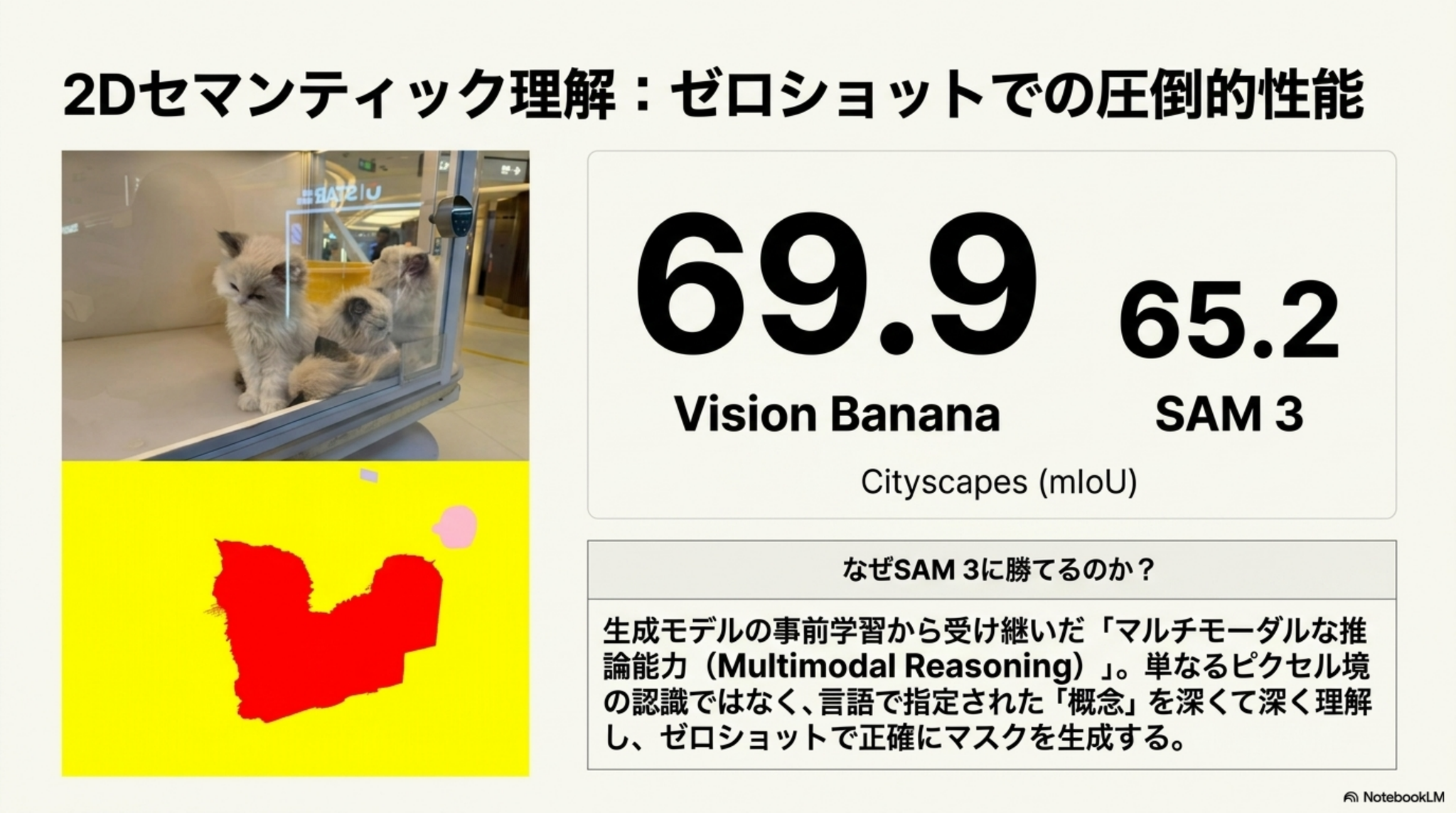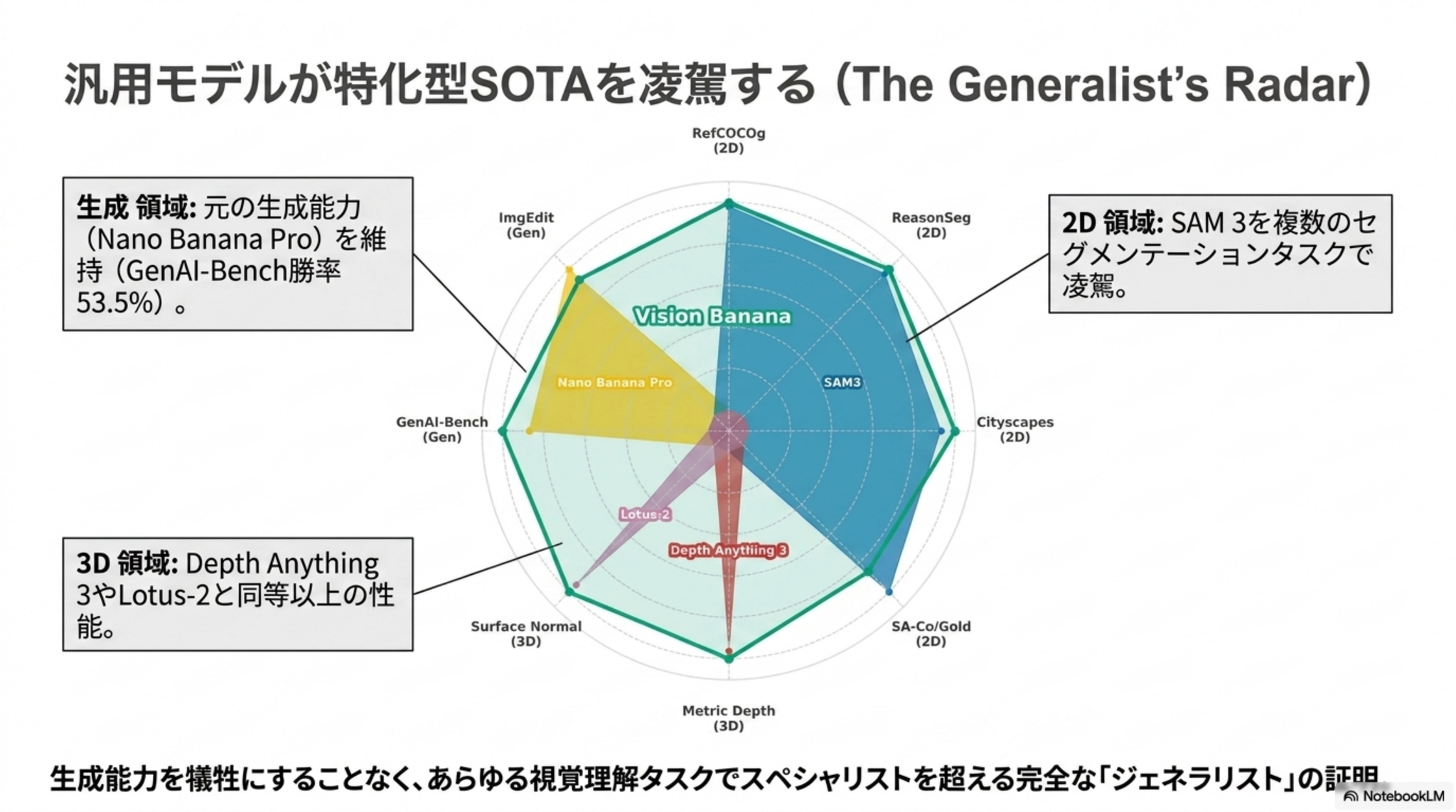 - 画像生成モデルNano Banana Proをベースにした「Vision Banana」を用い、分析結果を全てRGB画像として出力するように指示して知覚タスクを解かせた