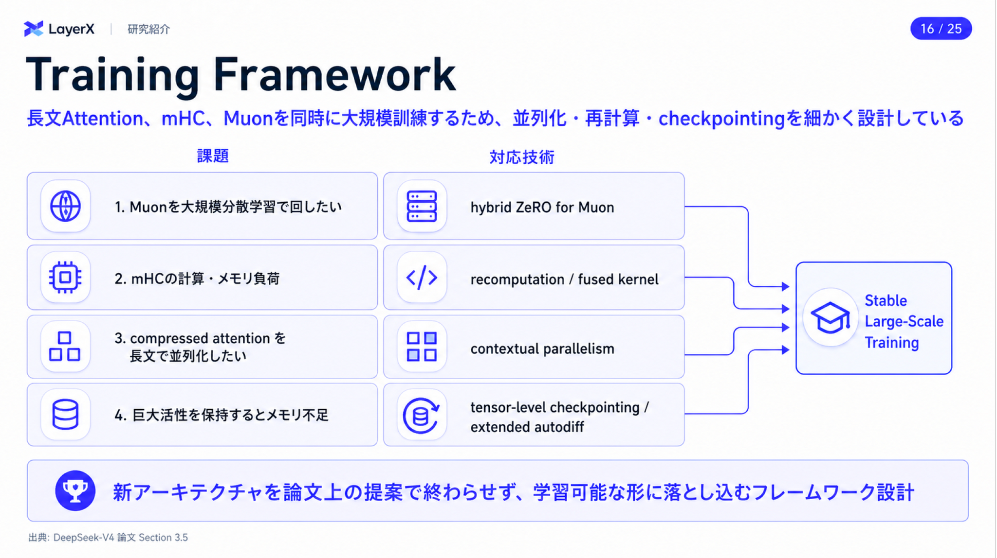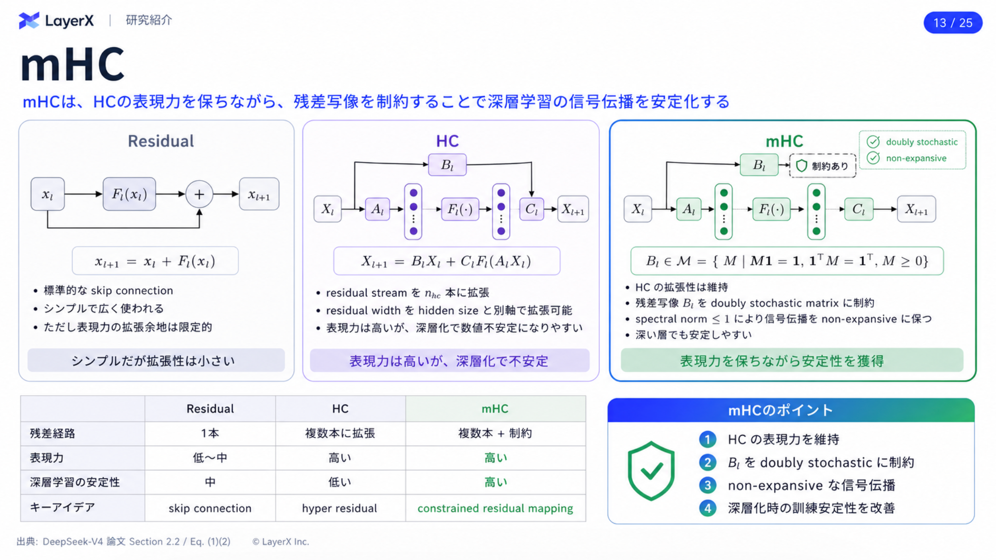 - 学習の安定化のためにResidual層を改良したmHCを採用
