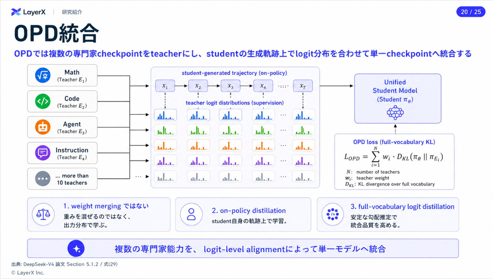 - 前段で作成した複数の教師モデルを統合するためにオンポリシー蒸留を行う
