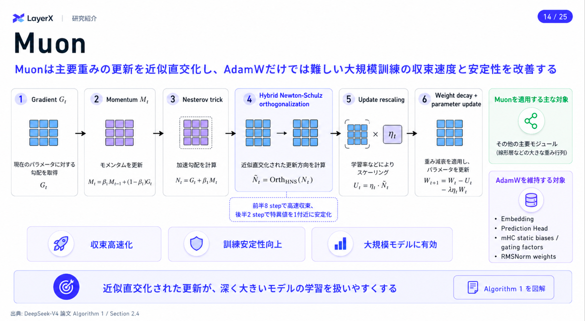 - 大規模訓練における収束速度と安定性を改善する役割