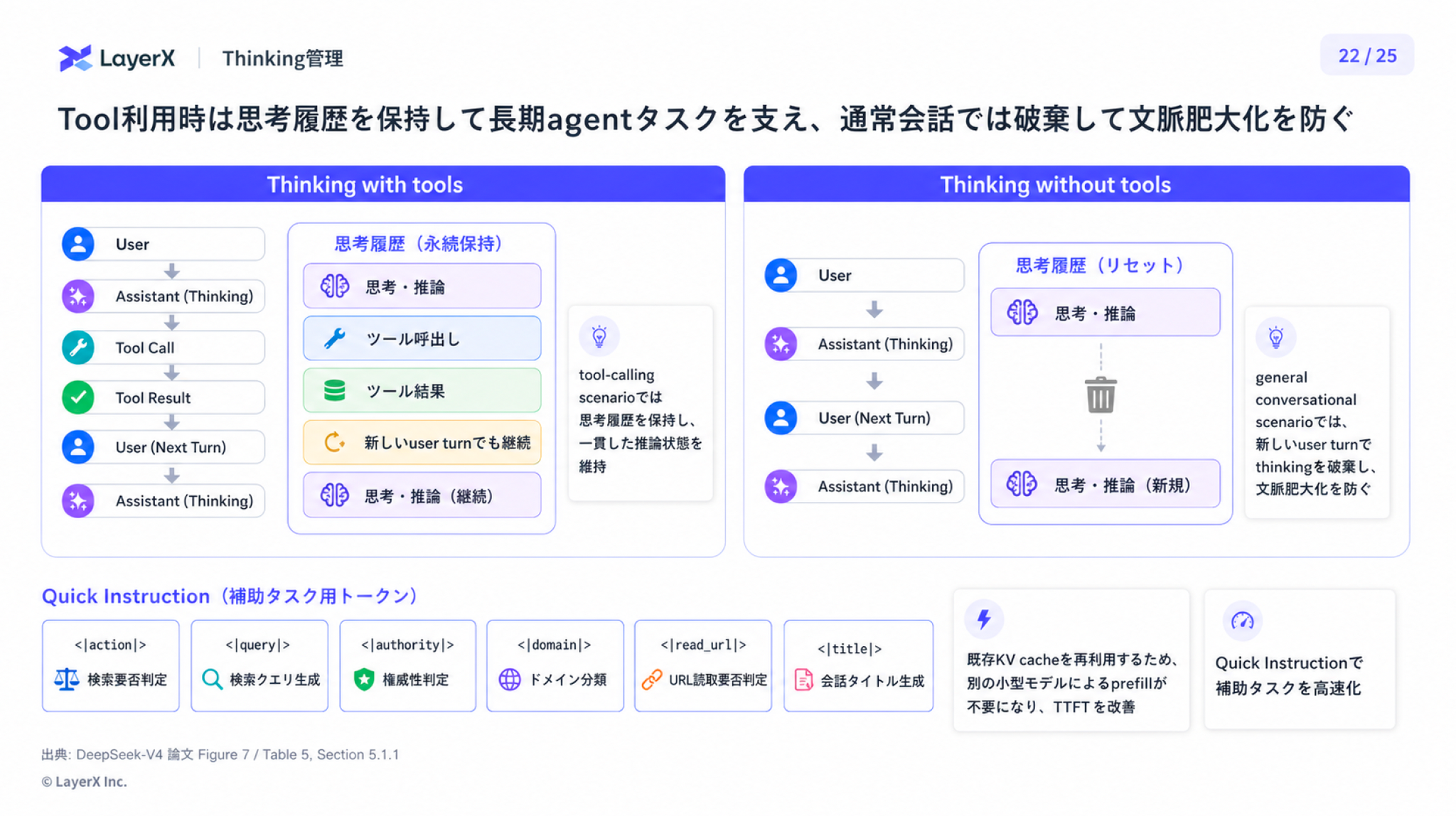 - DeepSeek‒V3.2では、新しいユーザーメッセージが到着すると思考履歴を破棄する文脈管理戦略を採用していた